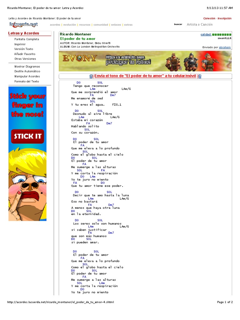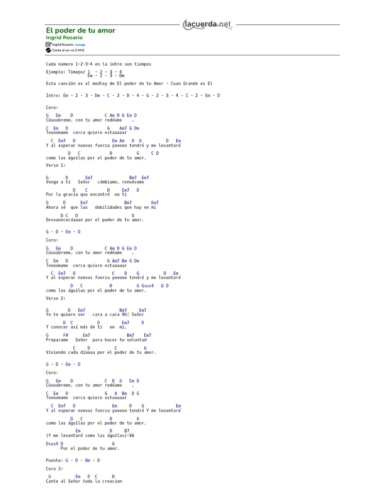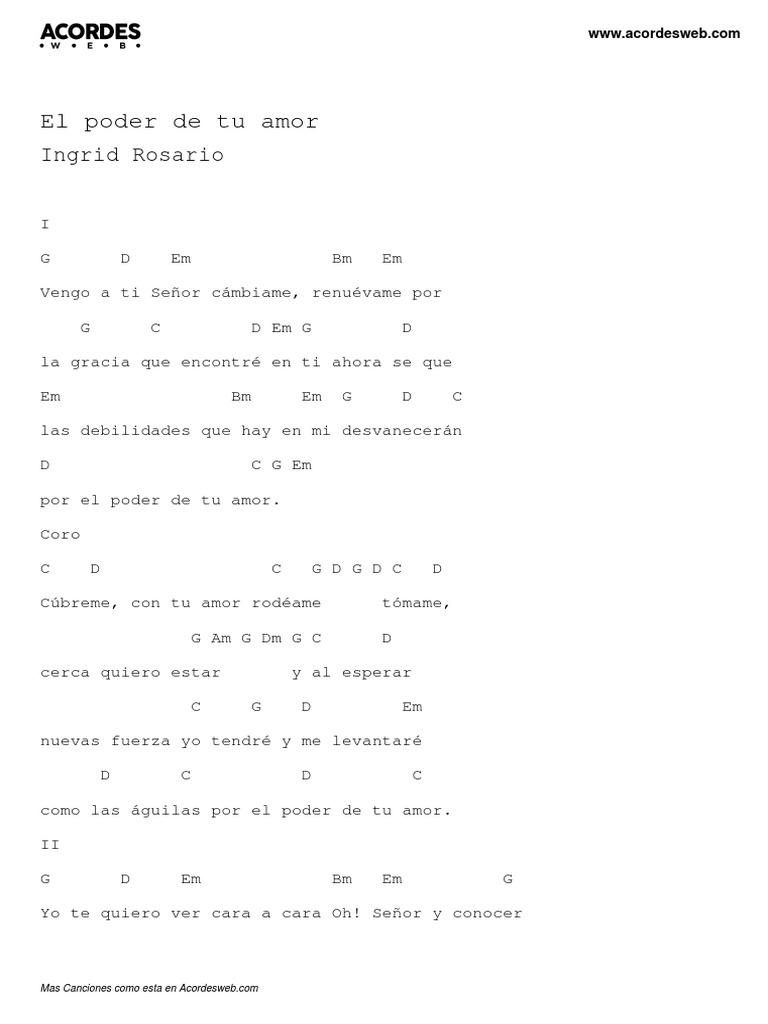 YO TE QUIERO VER. El Poder De Tu Amor Tab by Ricardo Montaner. Vengo a ti señor cámbiame renuévame. Por El Poder De Tu Amor chords by Ingrid Rosario. Learn to play guitar by chord tabs using chord diagrams transpose the key watch video lessons and much more. 276 views added to favorites 11 times. Play song with guitar piano bass ukulele.